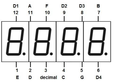 D1, D2, D3, D4는 각각 자리수를 선택한다. 나머지 핀은 7-segment 와 소수점(3번)을 표시한다.