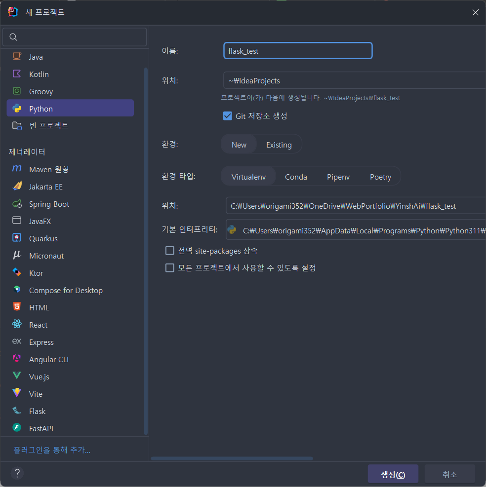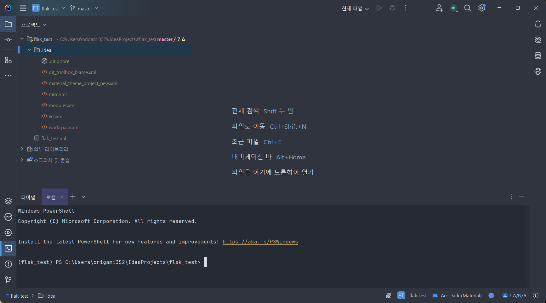 그럼 이렇게 Python 프로젝트가 만들어진다. 터미널에 명령어를 입력해 Flask 패키지를 설치해준다.