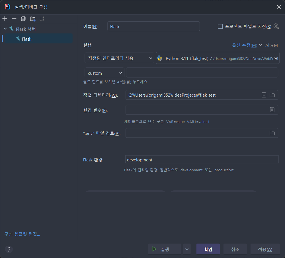 이제 우측 상단의 run을 누르거나 ctrl + shift + R 단축키로 실행해 Flask 서버를 실행한다.