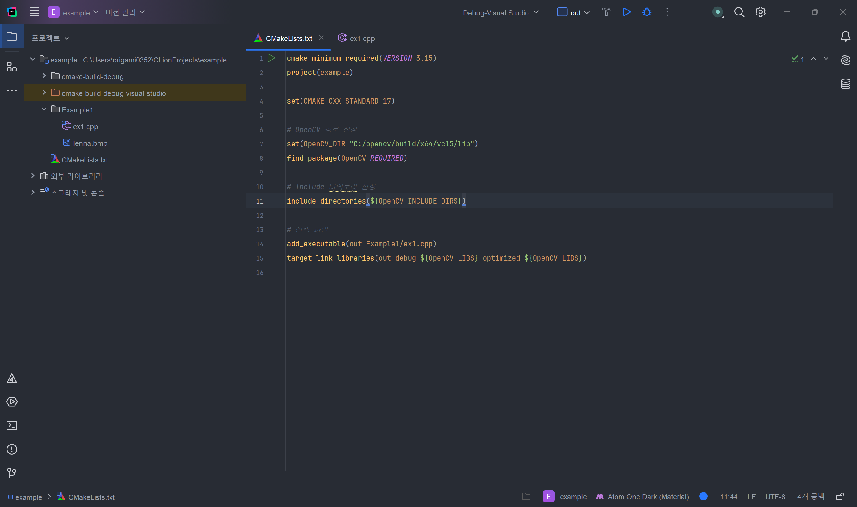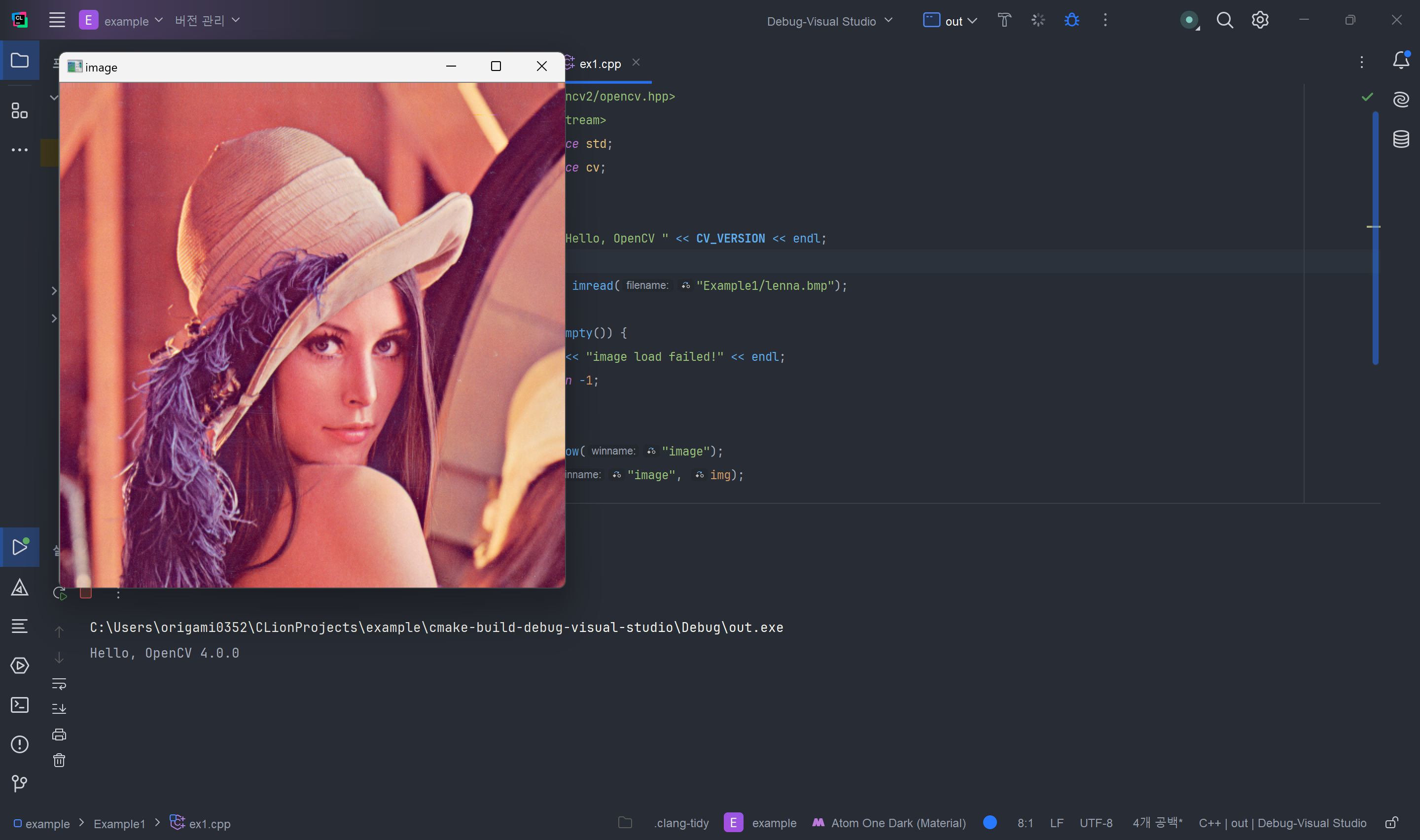 이유는 프로젝트 실행 파일과 소스코드 파일 경로가 일치하는지 여부에 따라 imread가 로드하는 파일의 상대경로가 달라지는 문제와, CMake 제너레이터에 따라 설정이 다를 수 있다. 필자는 간단하게 설치된 Visual Studio로 설정하였다. 그리고 작업 디렉터리를 지정해서 상대경로를 지정해주면 성공적으로 lenna.bmp파일을 불러올 수 있게 된다.