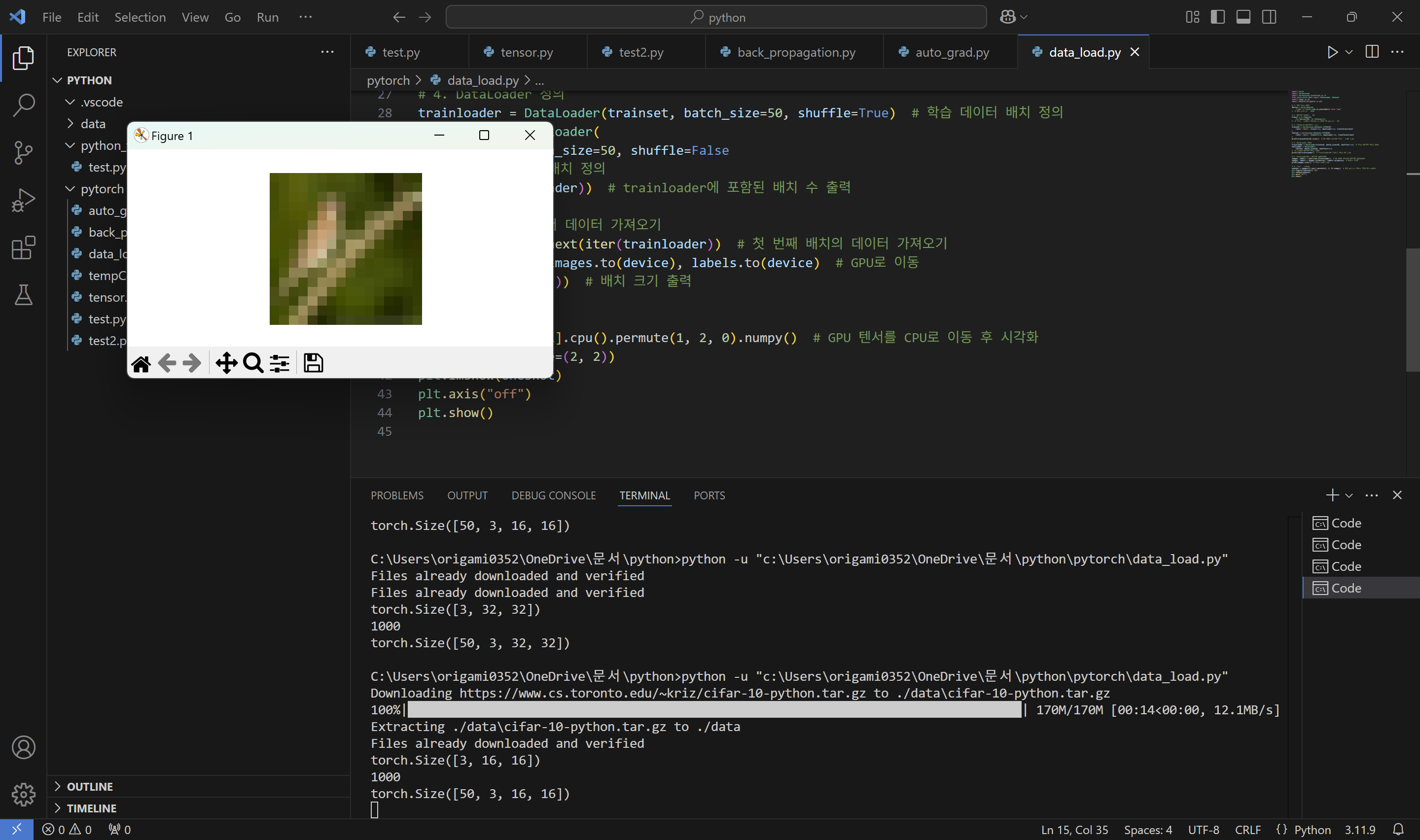 여기서 3은 채널 수, 16 x 16은 이미지의 너비와 높이이다. 일반적으로 컬러(RGB) 이미지는 (너비)x(높이)x(채널 수)로 크기가 표현되지만 PyTorch에서는 (채널 수)x(너비)x(높이)로 표현된다.